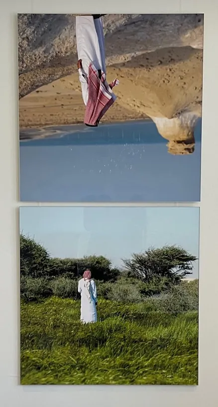 The dual nature of life is expressed in monochrome shots with bright red accents on traditional Qatari headdresses, symbolizing the energy of thought and life.”